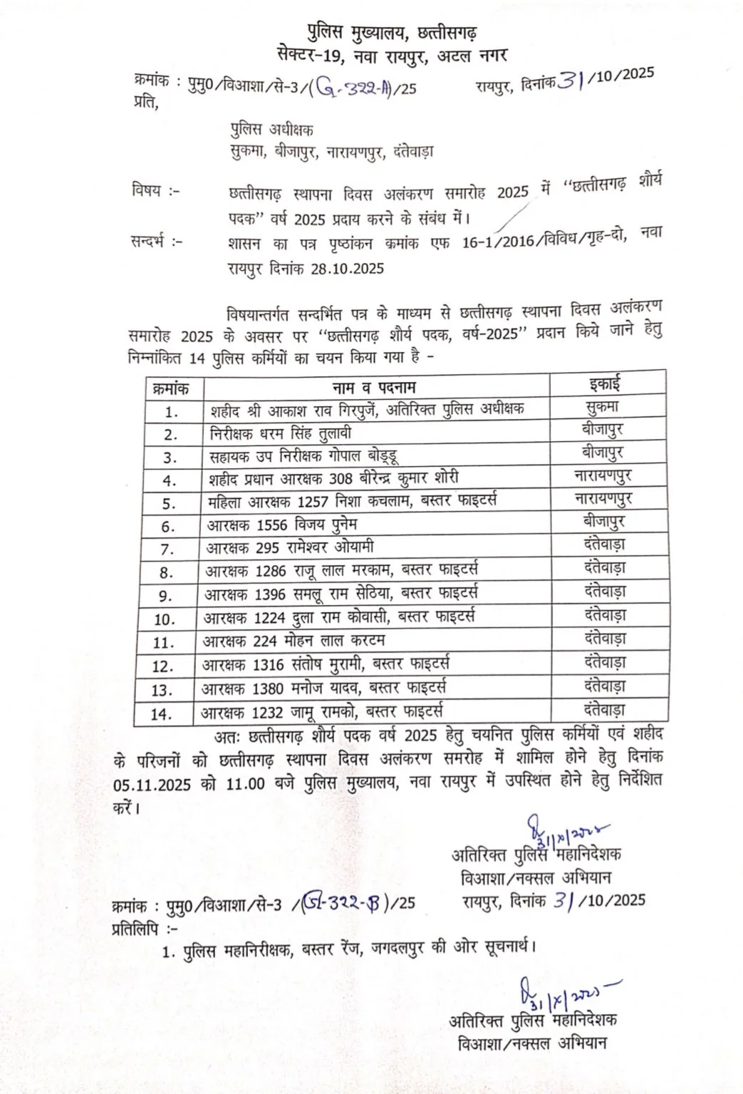 छत्तीसगढ़ राज्य स्थापना दिवस पर इस वर्ष 14 जांबाज पुलिसकर्मियों को ‘छत्तीसगढ़ शौर्य पदक’ से सम्मानित किया जाएगा। इनमें शहीद ASP आकाश गिरपुंजे का नाम सबसे ऊपर है, जिन्होंने नक्सल मोर्चे पर वीरता से लड़ते हुए अपने प्राण न्यौछावर किए।